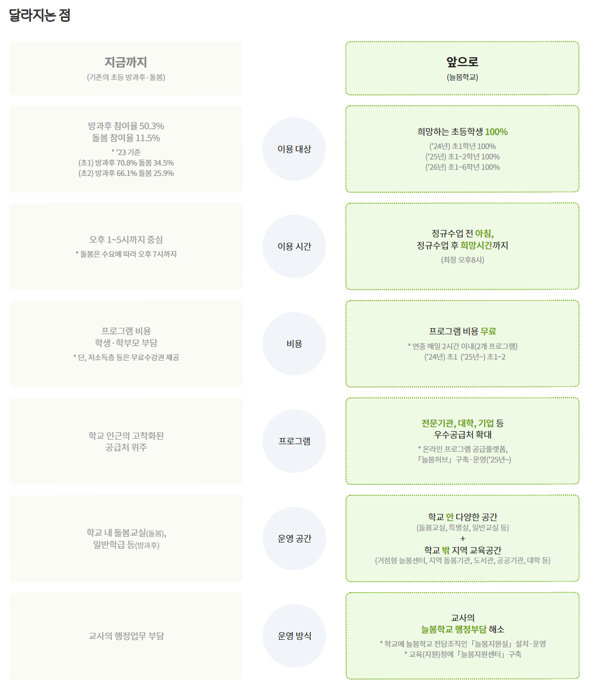 - 학교 밖: 지역 돌봄기관, 도서관, 공공기관, 대학 등 다양한 거점형 늘봄센터에서 운영됩니다.