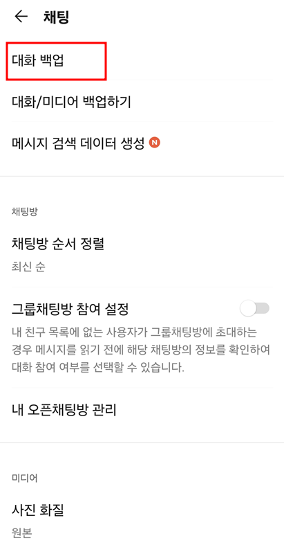 - 상단에 있는 '대화 백업' 버튼을 누릅니다.