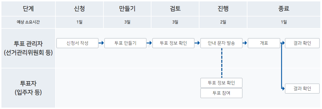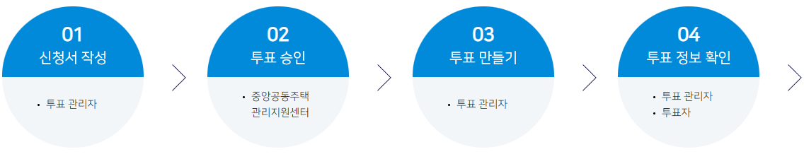 입주자와 관리자를 위한 특징들을 설명해 보았습니다. 입주자는 쉽고 간편하게 온라인 투표가 가능해졌고 관리자는 빠르고 정확한 개표가 가능해졌습니다. 아래의 절차는 복잡해 보이지만 전자 투표 방식은 매우 간단하기 때문에 쉽게 따라할 수 있습니다.