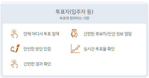 - 쉽고 간편한 투표 절차: 전자투표를 통해 입주자들은 복잡한 투표 과정 없이 간편하게 투표를 진행할 수 있습니다.