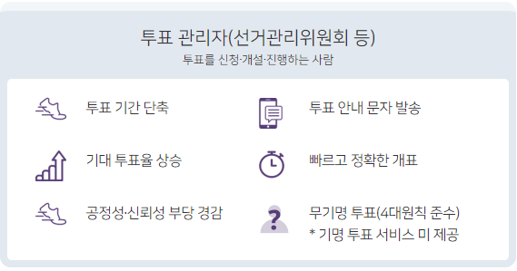 - 투명성과 신뢰도 제고: 전자투표 시스템을 통해 투표 과정이 투명하게 운영되며, 결과에 대한 신뢰도가 높아집니다.