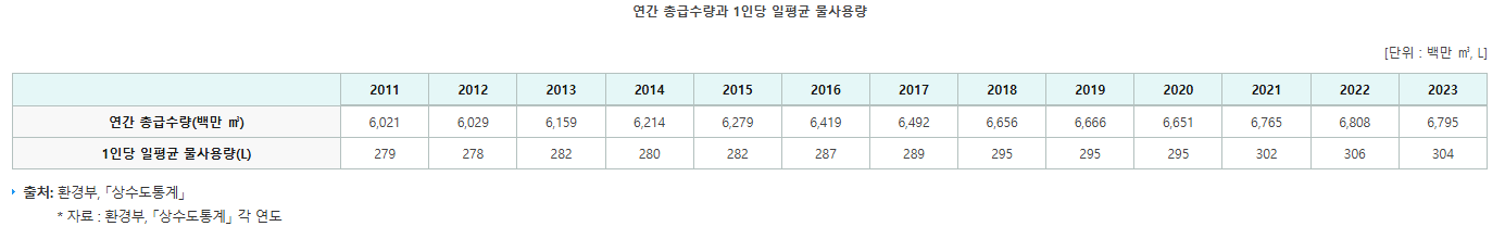 2023년 기준, 한국인의 1인당 일일 평균 물 사용량은 304리터로 집계되었습니다.