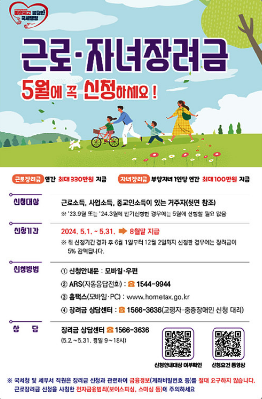 근로 및 자녀 장려금은 저소득 가구의 경제적 자립을 돕고, 삶의 질을 높이는 데 큰 도움을 줄 수 있는 제도입니다. 이번 2024년 기한 후 신청 기간을 절대 놓치지 말고, 여러분이 받을 수 있는 혜택을 꼭 챙기시길 바랍니다.특히 자녀가 있는 가구는 추가 혜택을 받을 수 있으니 더 많은 관심 부탁드려요.