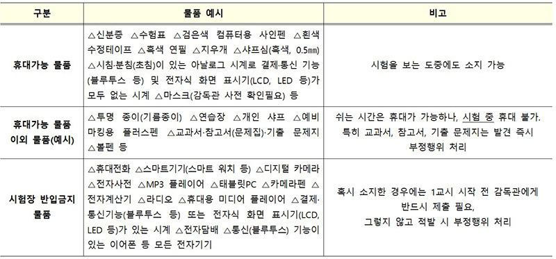 시험장 반입 금지 물품, 미리 확인하고 반납하세요