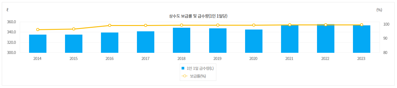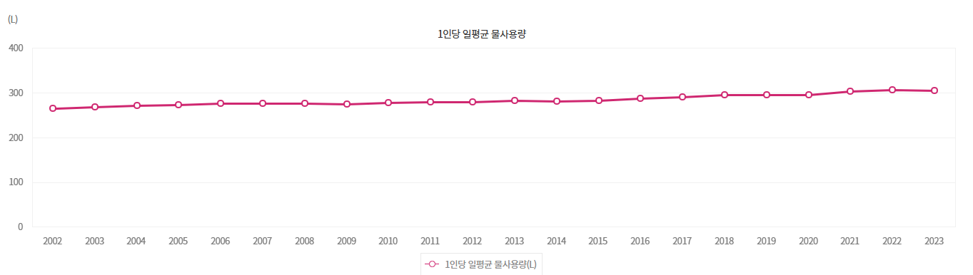 2023년 기준, 한국인의 1인당 일일 평균 물 사용량은 304리터로 집계되었습니다.