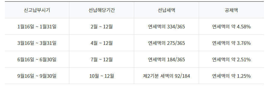 - 편리한 납부: 연납은 1월뿐만 아니라 3월, 6월, 9월에도 신청할 수 있으며, 해당 월의 16일부터 말일까지 신고 및 납부가 가능합니다.